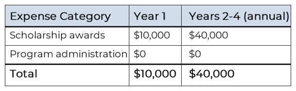 We request an initial grant of $10,000 to launch the CCTS STEM scholarship fund in the 2026–2027 academic year. Upon approval, we will: